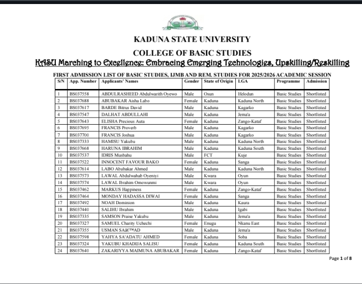 This is to inform the general public, especially all prospective candidates who applied for the Interim Joint Matriculation Board (IJMB) programme at Kaduna State University (KASU), that the university management has officially released the first batch of the admission list for the 2025/2026 academic session. This announcement comes as part of the university’s commitment to ensuring transparency and timely updates regarding the admission process for all interested and qualified applicants.