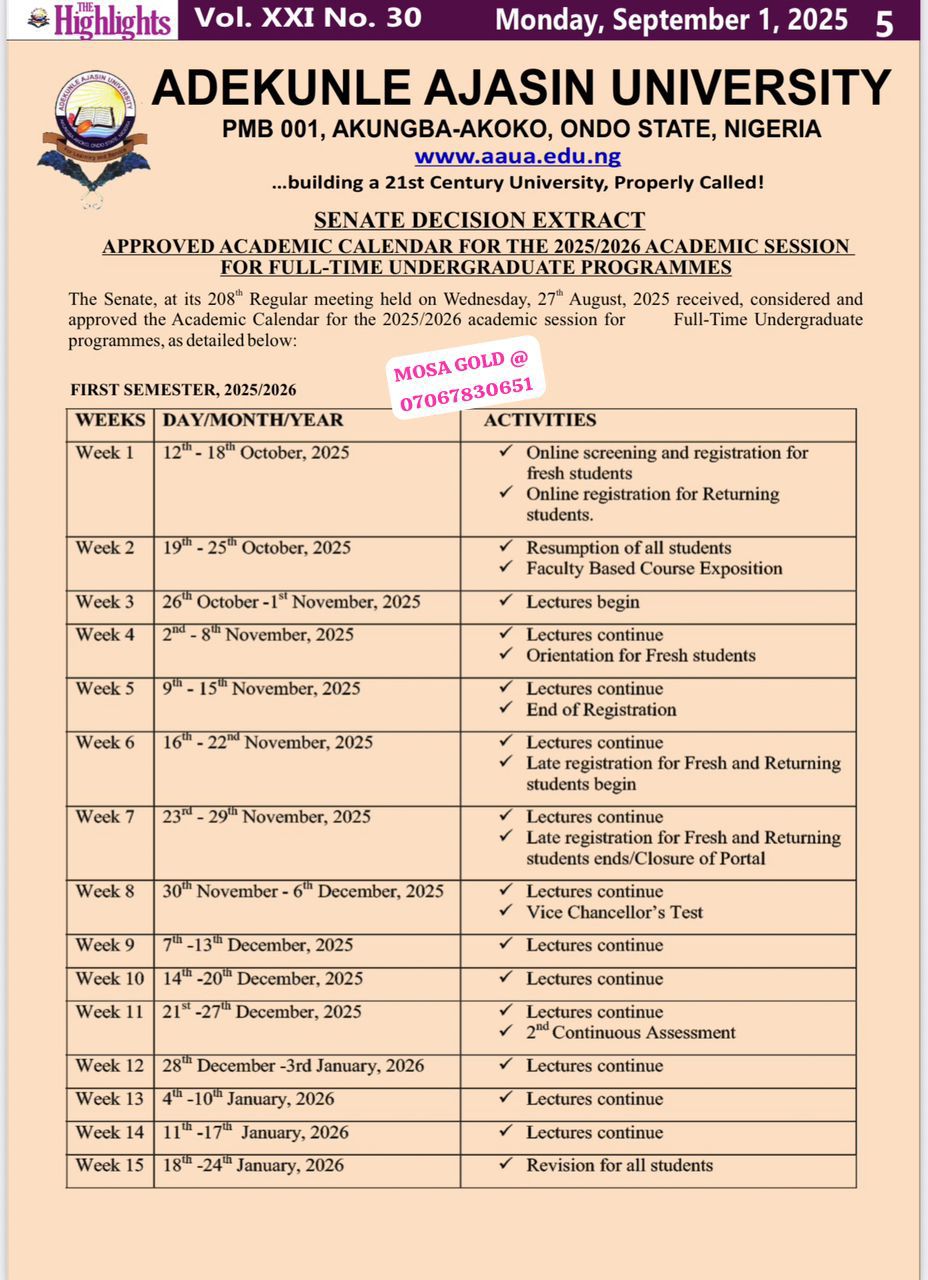 This is to inform all students of the Adekunle Ajasin University, Akungba-Akoko that the school management has released the approved academic calendar for the 2025/2026 Academic Session as follows;