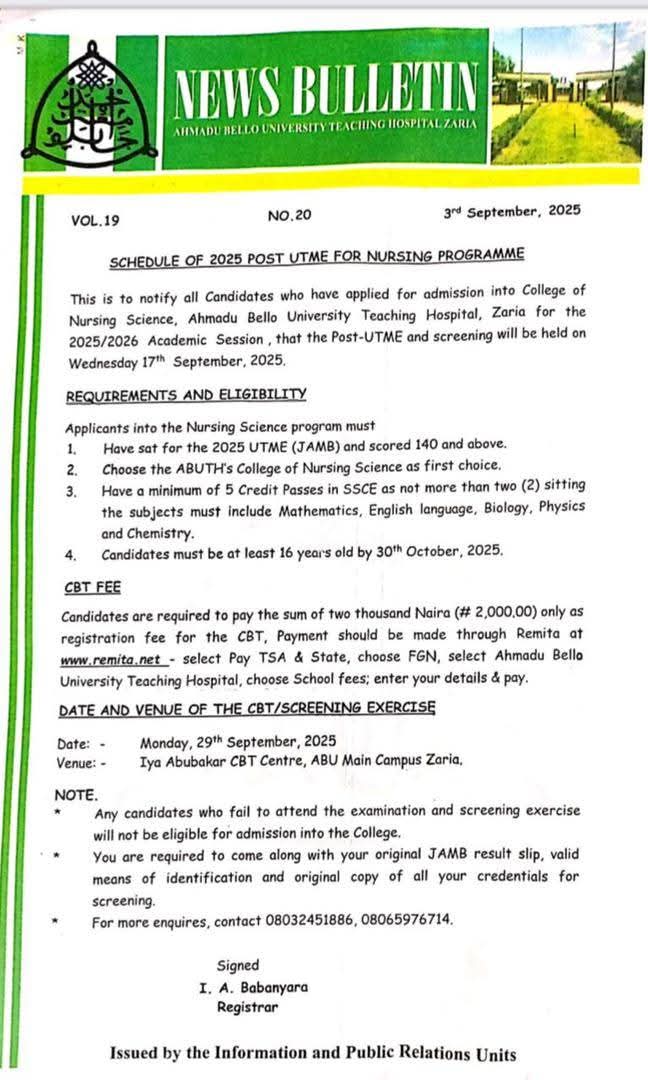 This is to notify all candidates who have applied for admission into College of Nursing Science, Ahmadu Bello University Teaching Hospital, Zaria for the 2025/2026 academic session, that the Post-UTME and screening will be held on Wednesday 17th September, 2025.