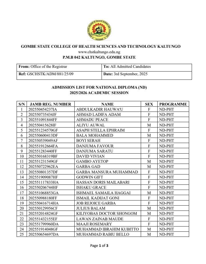 This is to inform the general public, especially all prospective students of the Gombe State College of Health Sciences and Technology, Kaltungo, that the school management has officially released the National Diploma (ND) admission list for the 2025/2026 academic session.
