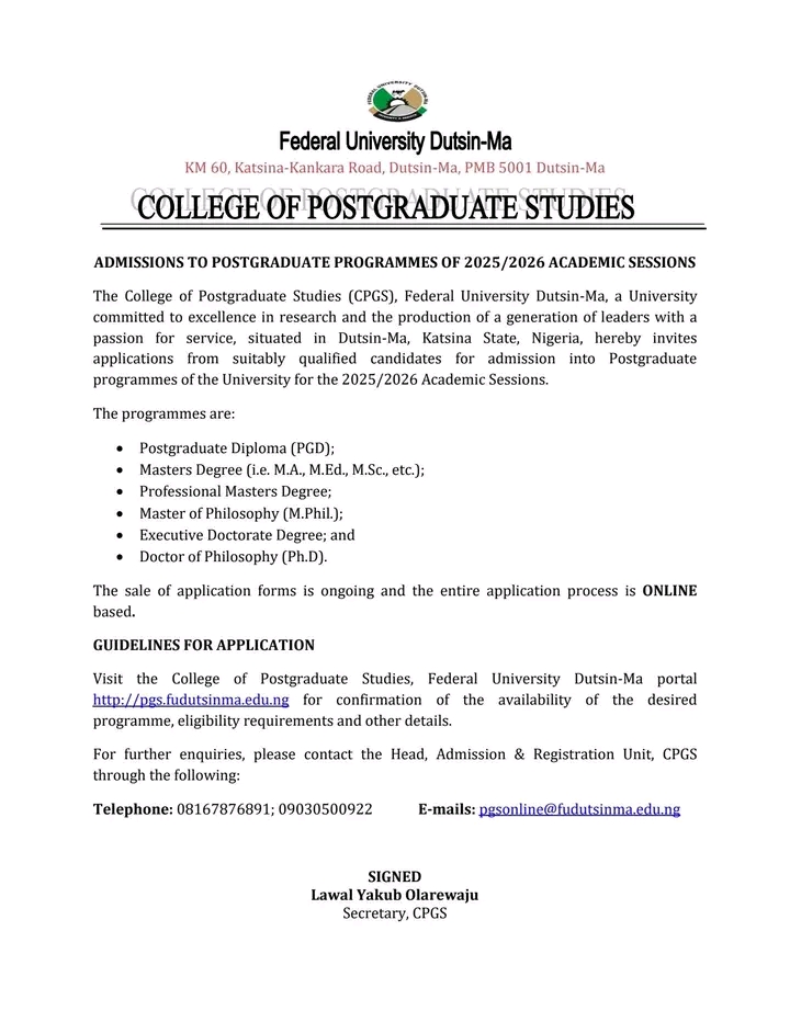 FEDERAL UNIVERSITY, DUTSIN-MA (FUDUTSIN-MA) RELEASES POSTGRADUATE ADMISSION FORM FOR THE 2025/2026 ACADEMIC SESSION