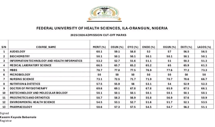 This is to inform the general public, especially all prospective students of the Federal University of Health Sciences, Ila-Orangun (FUHSI), that the school management has officially released the approved departmental admission cut-off marks for the 2025/2026 academic session.
