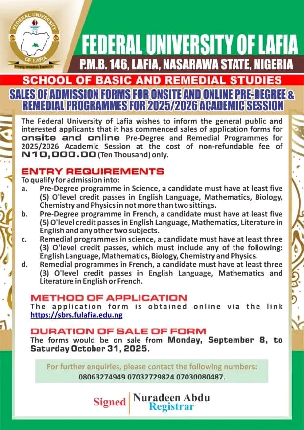 The Federal University of Lafia wishes to inform the general public and interested applicants that it has commenced sales of application forms for onsite and online Pre-Degree and Remedial Programmes for 2025/2026 Academic Session at the cost of non-refundable fee of N10,000.00 (Ten Thousand) only.