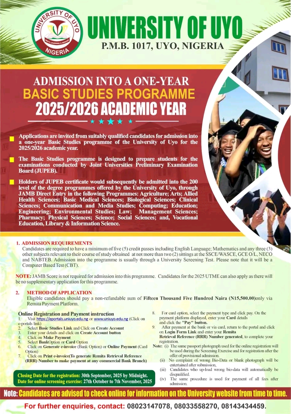 Applications are invited from suitably qualified candidates for admission into a one-year Basic Studies programme of the University of Uyo for the 2025/2026 academic year.