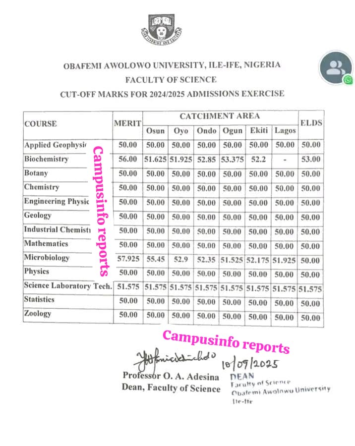 The management of Obafemi Awolowo University (OAU), Ile-Ife has officially released the Faculty of Science admission cut-off marks for the 2024/2025 academic session.
