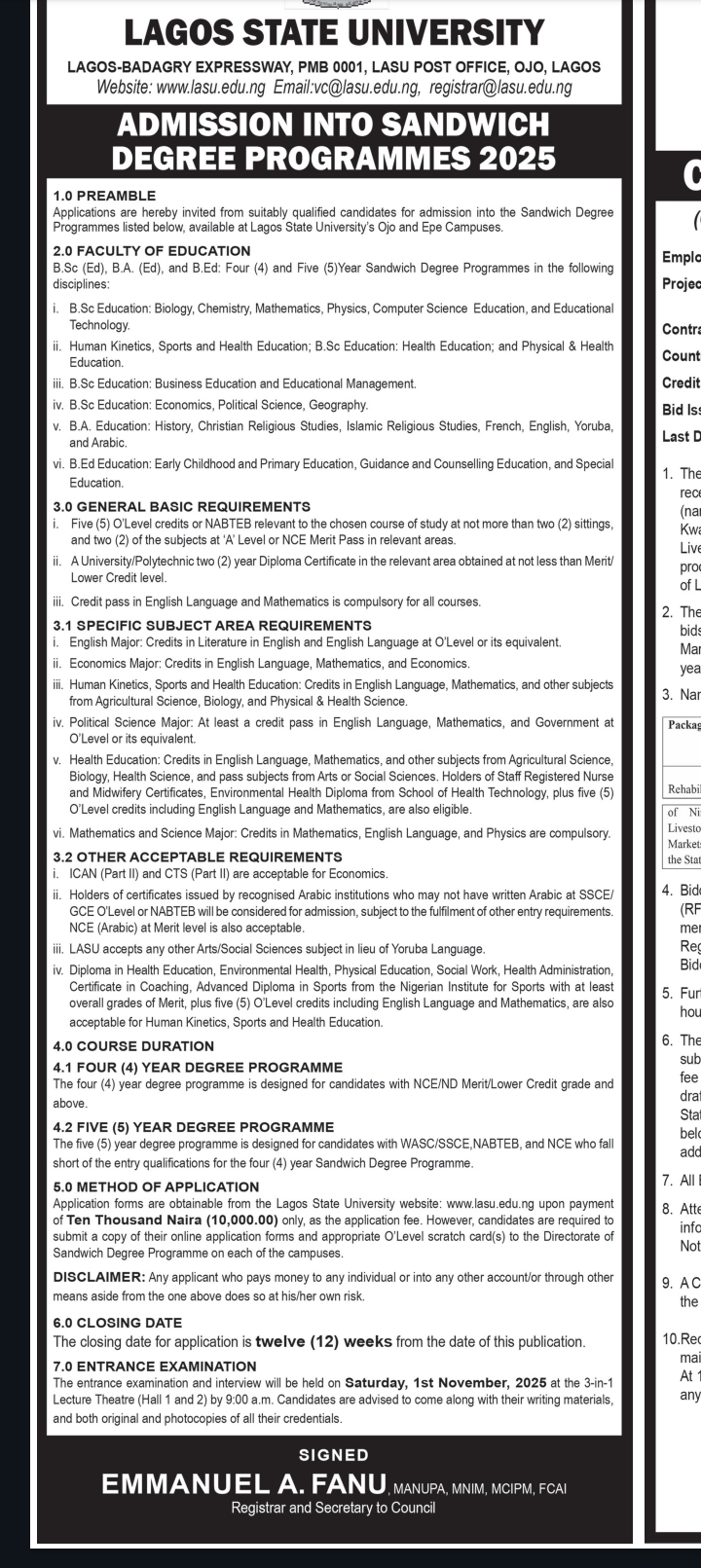 UUniversity LAGOS STATE UNIVERSITY, OJO [LASU] RELEASES ADMISSION INTO SANDWICH DEGREE PROGRAMME FOR 2025 MODULAR YEAR byAdminSeptember 12, 20251 minute read 0 Shares 0 0 0 0 The management of Lagos State University (LASU), Ojo, has officially announced the release of admission forms for its Sandwich Degree Programme for the 2025 Modular Year. 0 0 0 0 Share 0 Tweet 0 Tags:Admission News 0 Shares: Share 0 Tweet 0 Pin it 0 Share 0 Share 0 Admin Leave a Reply Cancel replyYour email address will not be published. Required fields are marked *Comment * Name * Email * Website Save my name, email, and website in this browser for the next time I comment. Δ View Comments (0)