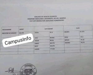 The management of Obafemi Awolowo University (OAU), Ile-Ife has officially released the College of Health Science admission cut-off marks for the 2024/2025 academic session.