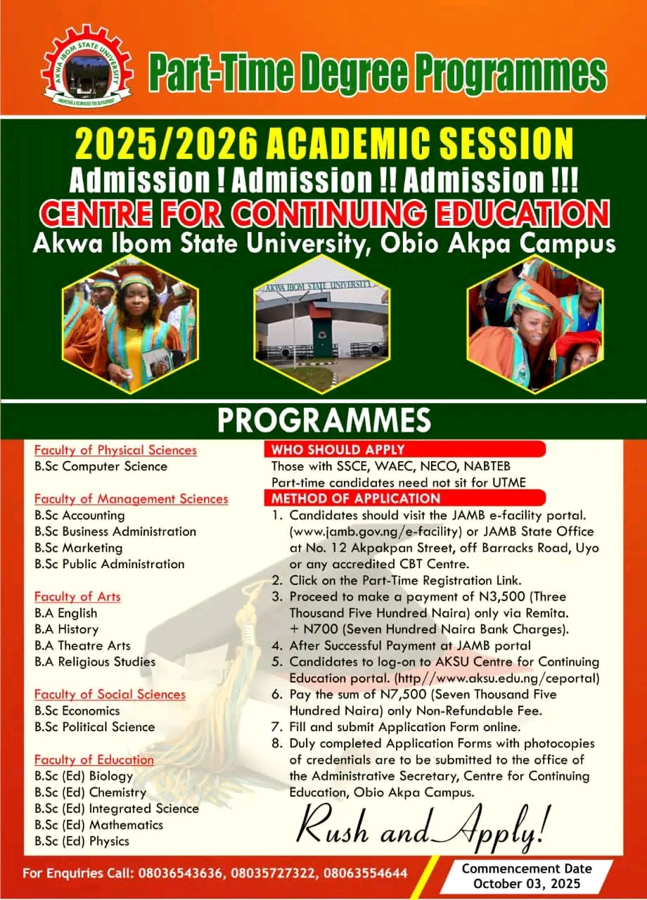 The Management of Akwa Ibom State University(AKSU) through its Centre for Continuing Education, Obio Akpa Campus, is pleased to announce the commencement of Admission into its Part-Time Degree Programmes for 2025/2026 Academic Session.