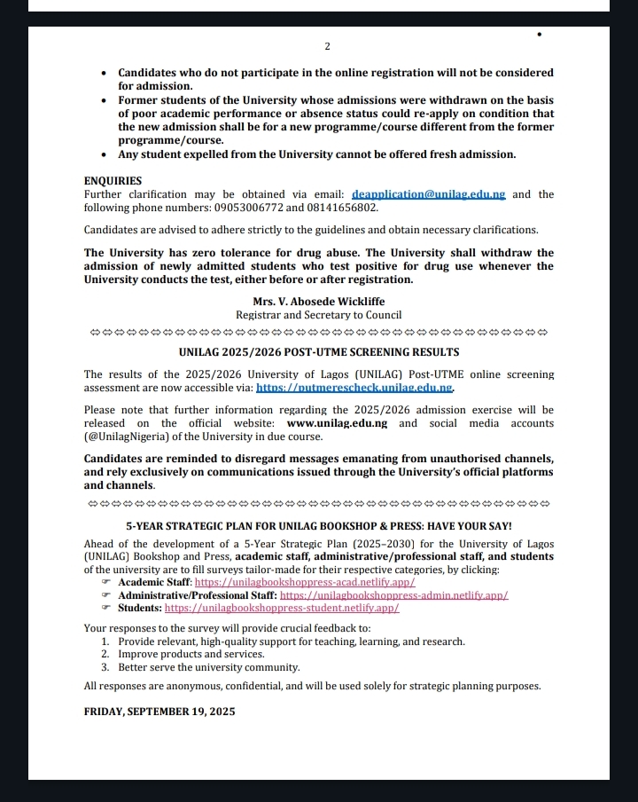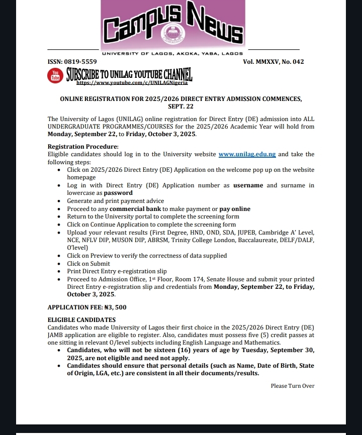 UNIVERSITY OF LAGOS [UNILAG] RELEASES DIRECT ENTRY ADMISSION FORM FOR THE 2025/2026 ACADEMIC SESSION