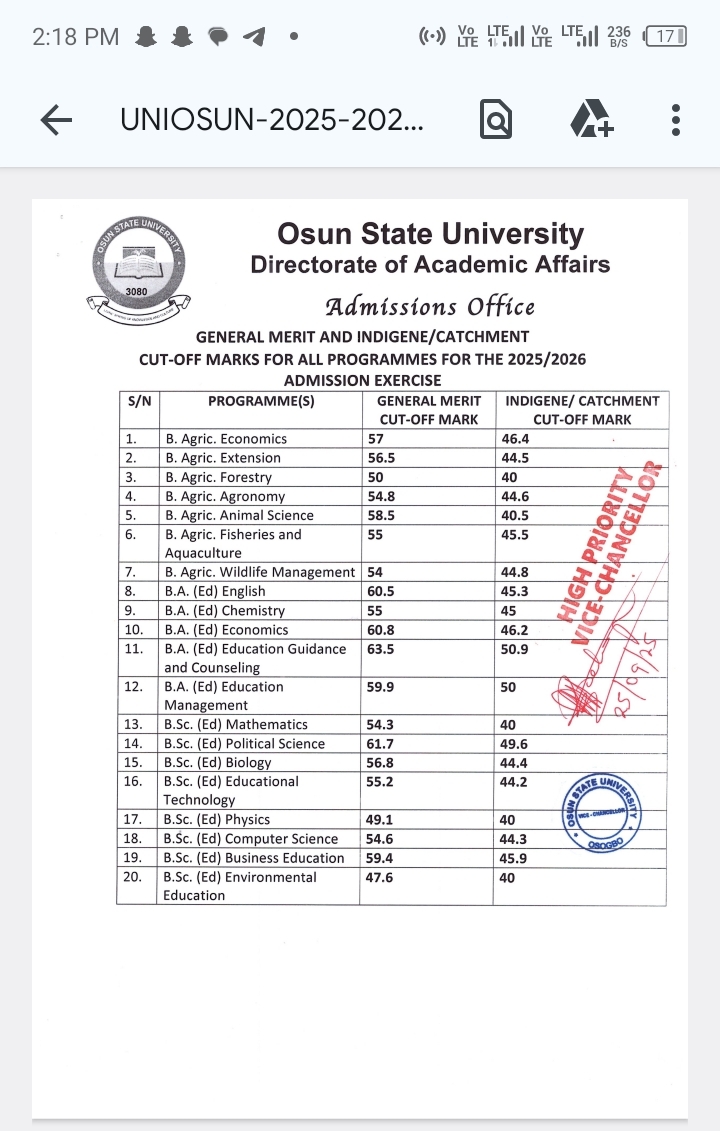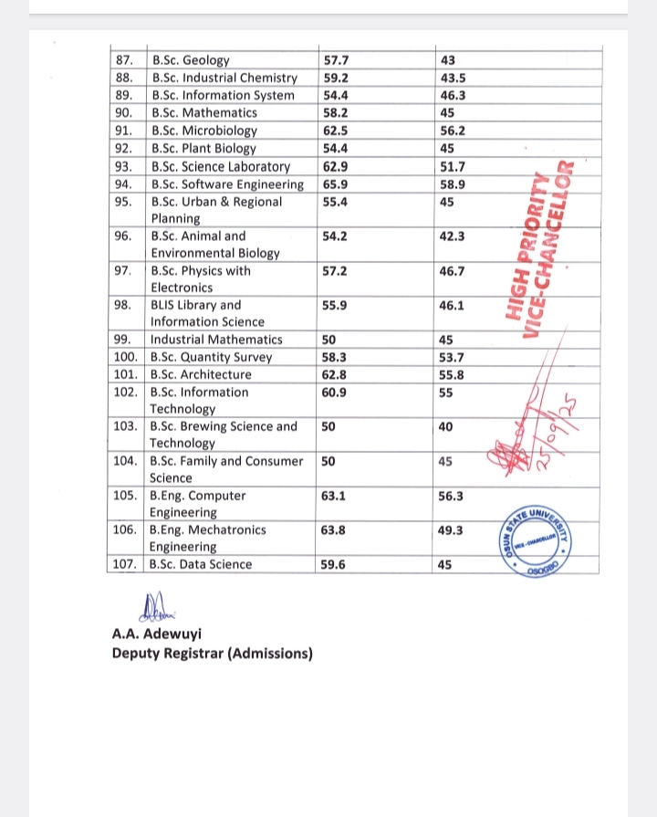 Osun State University (UNIOSUN) has officially released the departmental cut-off marks for the 2025/2026 academic session. This important announcement will guide candidates who participated in the Post-UTME screening exercise in determining their chances of securing admission into their chosen courses.