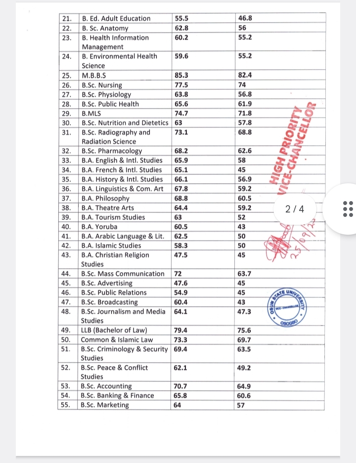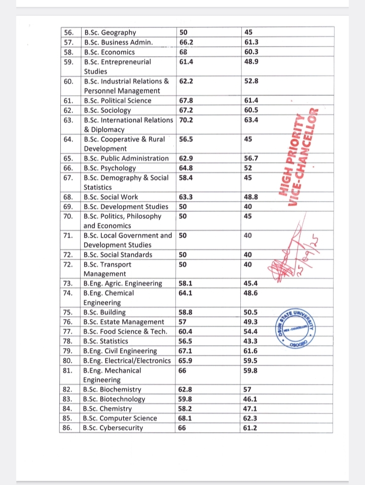 The cut-off marks represent the minimum score candidates are required to meet or exceed before they can be considered for admission into various departments across the six campuses of the institution. These benchmarks were carefully set by the university management after reviewing applicants’ performances in the Post-UTME screening, JAMB results, and the available admission quota for each programme.