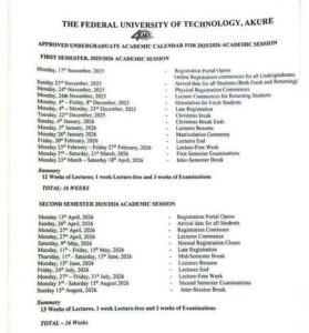 The Federal University of Technology, Akure (FUTA) has officially published its comprehensive undergraduate academic calendar for the 2025/2026 academic session, outlining all key dates and activities for both the first and second semesters. This release provides vital guidance to students, parents, and staff as they prepare for the upcoming academic year.
